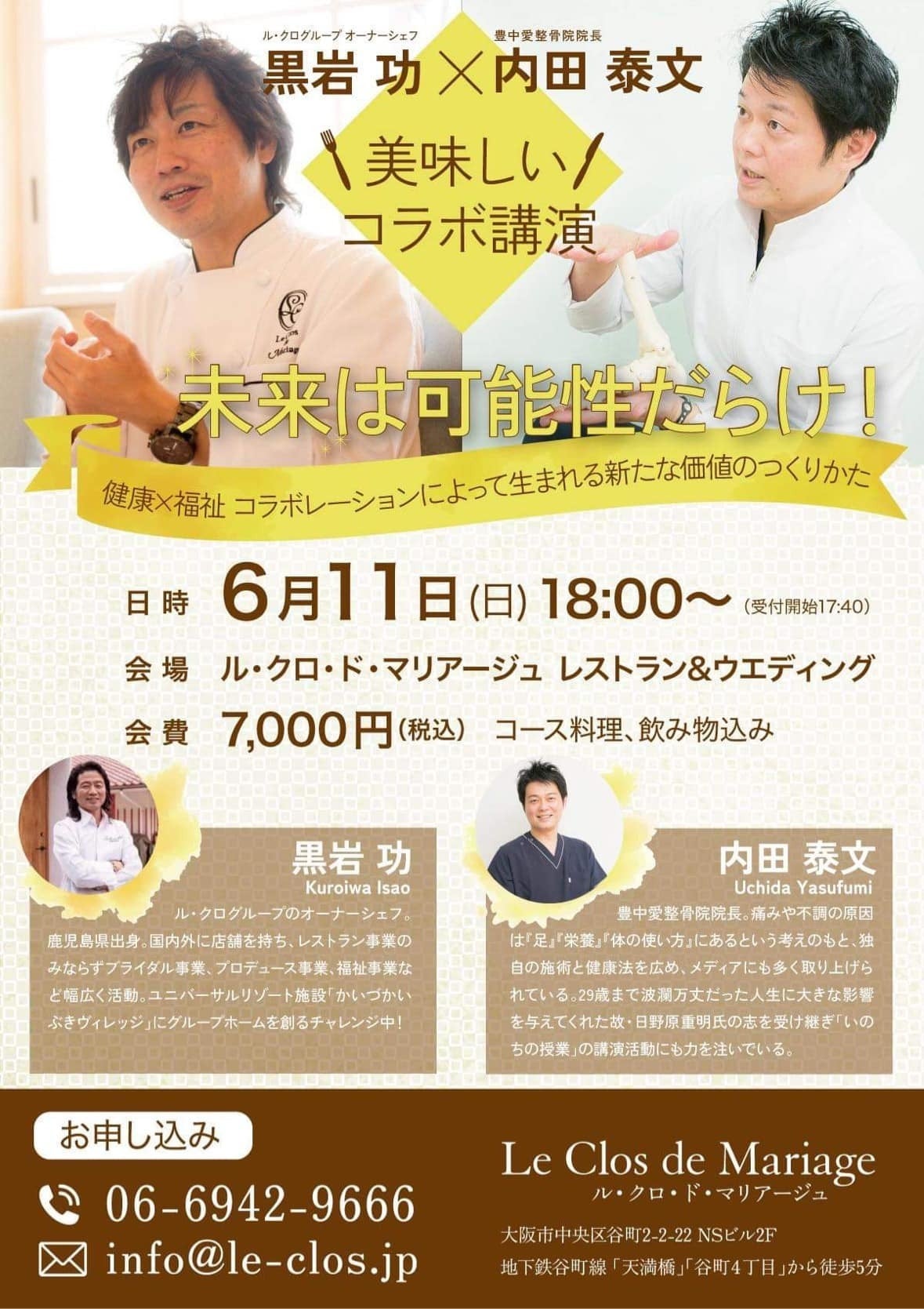 6月11日(日)に、私の心友.ウッチャン事内田さんと、健康セミナー×トーク交流会が、お昼と夕方と二部制で開催します。皆さんとの距離感を大事にする為に、規模をコンパクトに2つの時間に分けました。是非2人のダイニングに遊びに来る感じでご参加してください。健康と健考な話しが山盛りの時間になります--------------------------------------------◆日時:2023年6月11日(日) 昼の部 11:30受付、12:00開始夜の部 18:00受付 18:30開始 →17:40受付 18:00開始に変更になりました。◆場所:ル・クロ・ド・マリアージュ〒540-0012 大阪市中央区谷町2-2-22 2F◆参加費:7,000円(お食事付)--------------------------------------------ホントに皆さんと会話するぐらいの、距離感が近い時間になると思います。もちろんル・クロの美味しいお料理も楽しみにしておいてください。そして、次回は6月15日(木)に車椅子インフルエンサーの中嶋涼子さんと講演会をします。--------------------------------------------◆日時:2023年6月15日(木) 18:30受付 19:00開始 22時まで◆場所:ル・クロ・ド・マリアージュ〒540-0012 大阪市中央区谷町2-2-22 2F◆参加費:6,500円(コース料理、飲み物込)--------------------------------------------皆様、ぜひご参加くださいませ!----------------------------------------------------------「かいづかいぶき温泉」の母屋をリフォームし「温泉付きグループホーム」を開設します。障がいのある方が支援やサポートを受けながら共同生活をし、農業や宿泊業や飲食業で働く環境を創ります。皆様、どうぞ応援お願いいたします!https://camp-fire.jp/projects/view/669055----------------------------------------------------------ル・クログループ https://www.fooding.co.jp/ル・クログループの福祉 https://www.le-clos.jp/shop/shop-labo/【動画】レストラン×福祉×働くための学校 https://youtu.be/Dj1br1ol-tg【動画】ユニバーサルレストラン https://youtu.be/HppUkrX0dMA【インタビューvol.1】プロのシェフと障がいのある方が一緒に働く空間----------------------------------------------------------