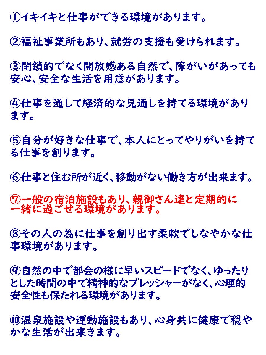 障がい者の方々に素晴らしい自然の環境の中で、住みがいがある環境と働きがいがある環境の中で、穏やかに、1人1人の人生の目的と目標に見通しがある生活をしてもらう事が目標です。