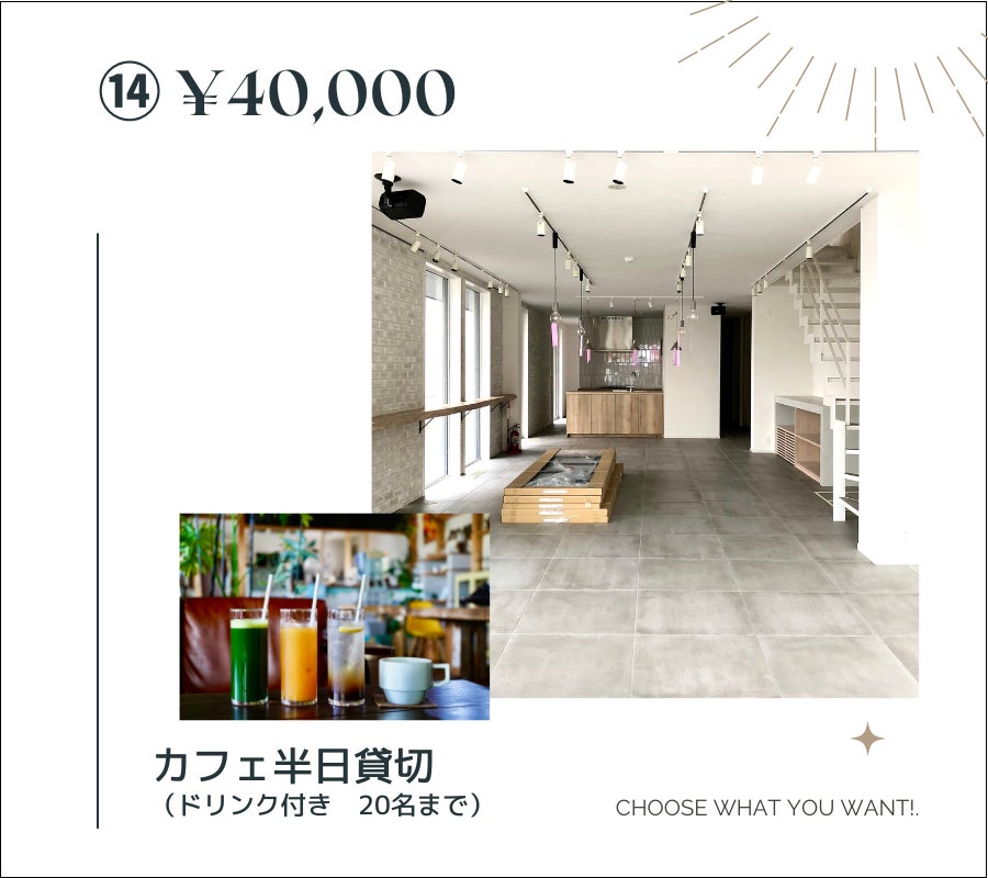 ⑭ ¥40,000 カフェ半日貸切(ドリンク付き 20名まで)