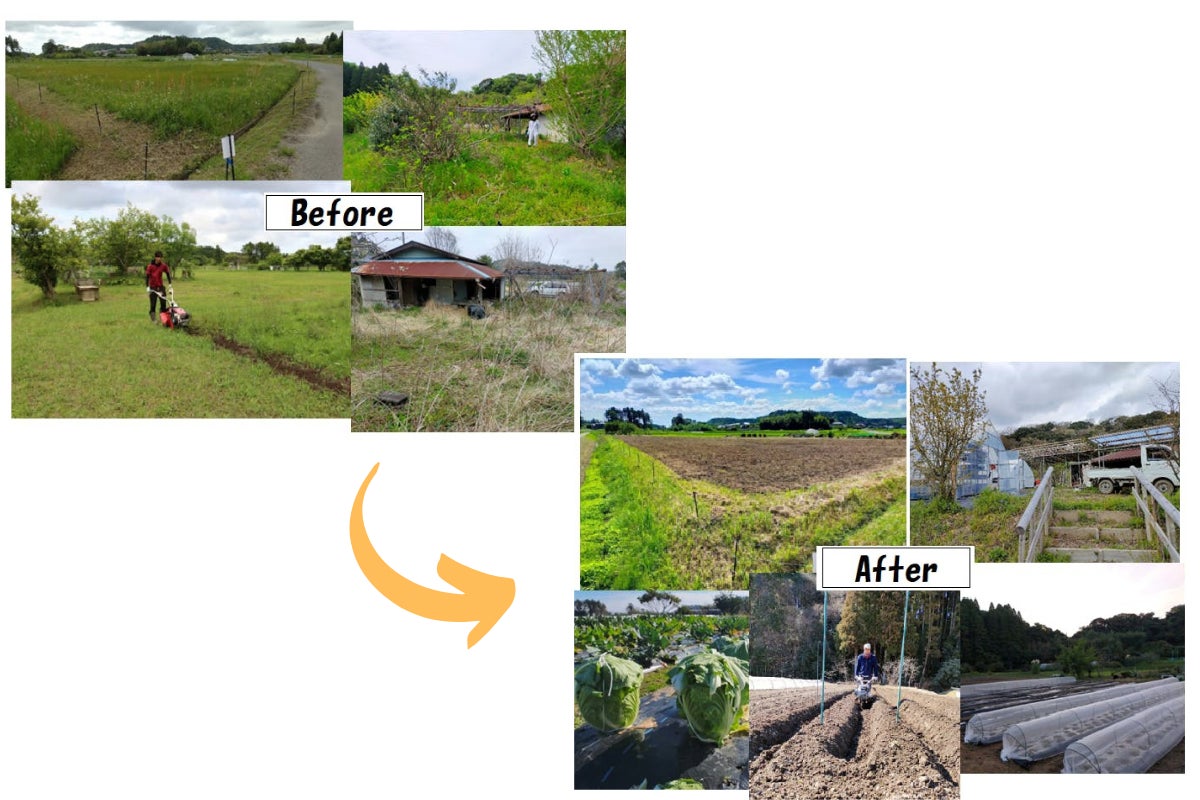 30年以上も耕作放棄されていた場所をお借りして畑をはじめました。草を刈り、耕し、畝を立て、少しずつ畑に変えて野菜を育てています。
