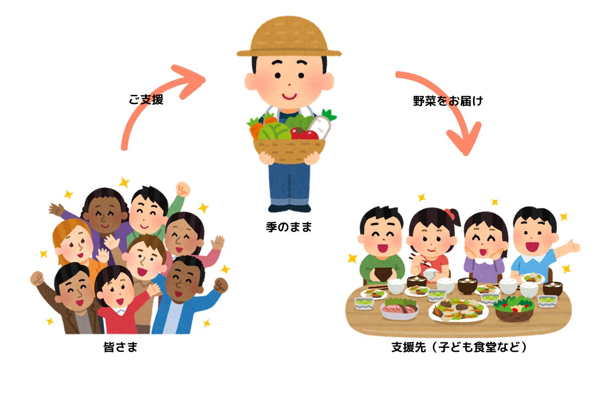 「オモ・ヤサ野菜たち」を『季のまま』から直接、食料品を必要としている人たちにお届け(発送)するためのプロジェクトです。皆さまからのご支援を、送料や包材費に充て、野菜を届けることに活用させていただきます。支援先は『子ども食堂』や『フードバンク』、『保育所』、『福祉・介護施設』、『炊き出し』などを予定しています。