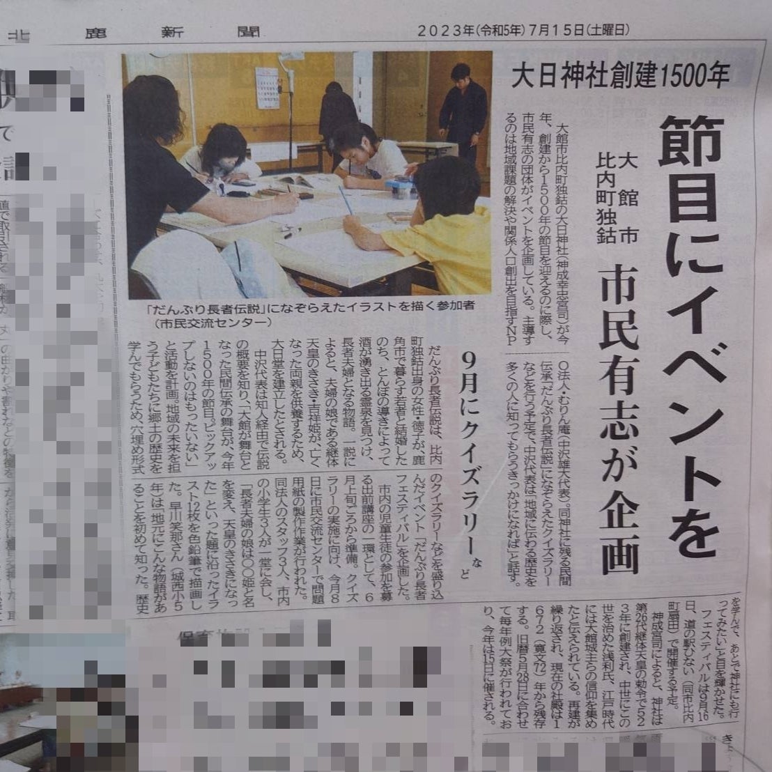 2023/08/20 15:002023.07.15①「北鹿新聞」に掲載 子どもたちとの準備の様子が載りました。②紙芝居兼クイズ用紙完成 子どもたちと描いた絵を使って作りました。 もっと見る