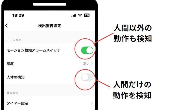 ※スマホでモード切り替えすることで、人間以外(動物や車など)を検知することも可能です。