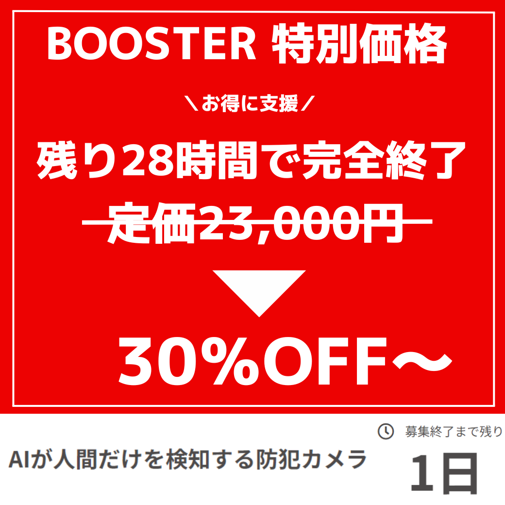 残り28時間で終了します。https://camp-fire.jp/projects/view/669330人間だけを検知するAI防犯カメラは、「人間による不審な動きや侵入を検知し、それをあなたに即座に通知する」機能が最大の特徴でもあり、基本ベースとなる機能になっております。防犯カメラは、あなたやあなたの家族を不審者や侵入者から守るためのツールです。そのため、人間の動きを正確に検知し、それをユーザーに即時に通知する能力は非常に重要です。しかし、従来の防犯カメラでは、風による草木の揺れや動物の動きなど、人間以外の動きも検知してしまい、誤報を引き起こすことがありました。今回ご紹介している「人間だけを検知するAI防犯カメラ」は、そのような誤報を大幅に減らすことができます。これにより、不要な警告に煩わされることなく、本当に注意が必要な瞬間だけに意識を向けることができます。防犯カメラの効果を最大化し、あなたへの安心感を高めてくれると確信しています。特別価格で購入できるキャンペーンも残28時間で終了となります。◇数量の変更◇決済途中の手続き◇実家用の買い足しなどなど、明日の23時59分で割引キャンペーンはは完全に終了します↓https://camp-fire.jp/projects/view/669330お気に入りに登録したまま購入を忘れていしまっている方が多くいらっしゃるようです。終了は明日の火曜日なので、忘れてしまわないうちに手続きを完了してくださいね!https://camp-fire.jp/projects/view/669330