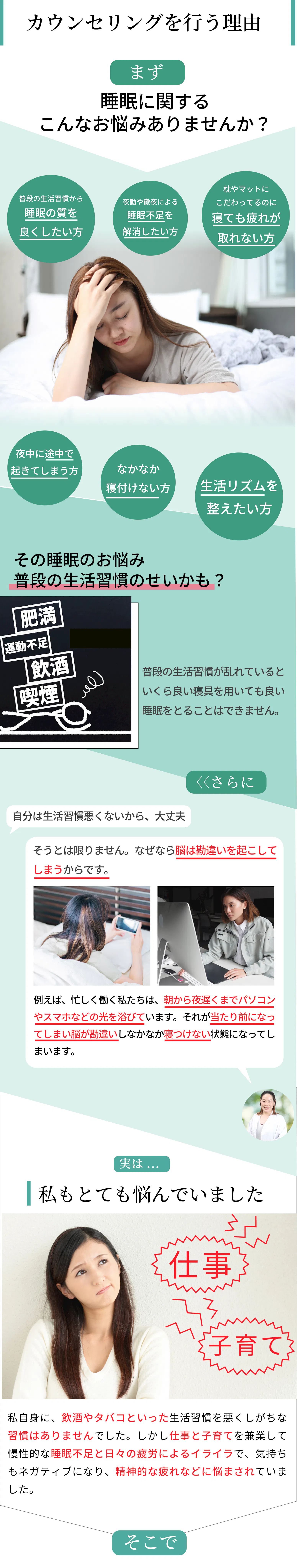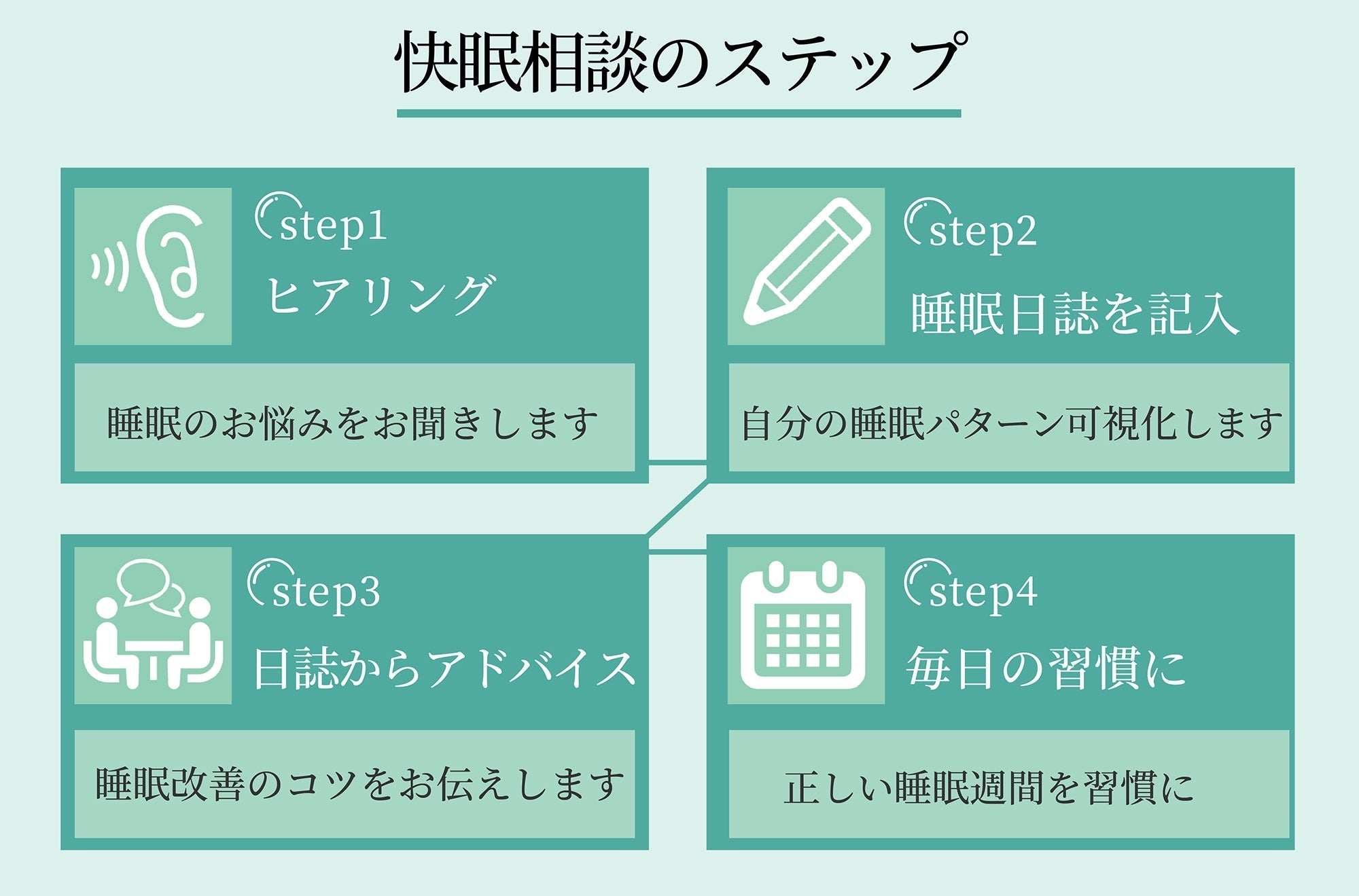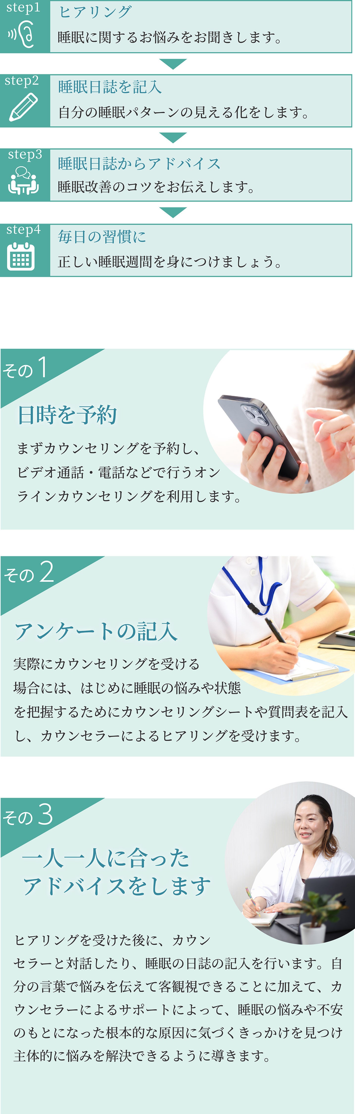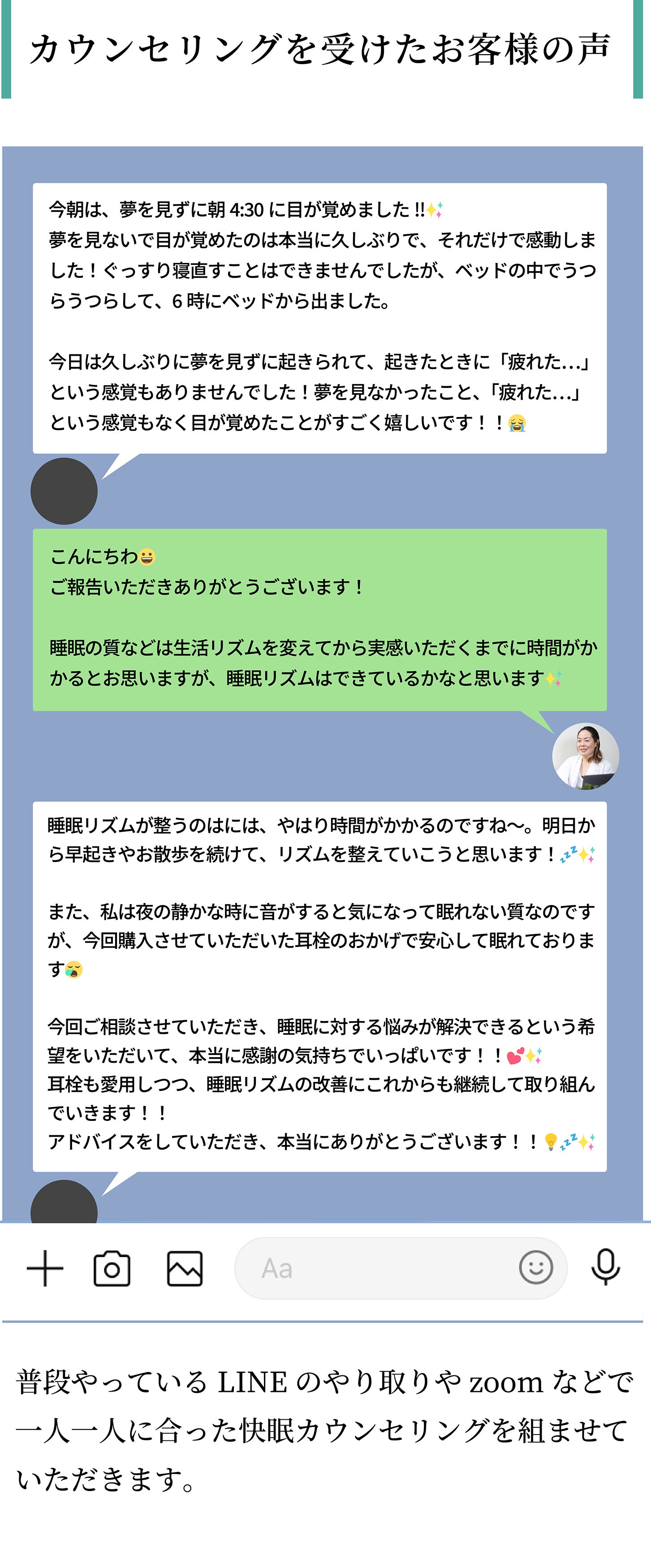 カウンセリングから快眠アイテムの開発、快眠アイテムの商品改善のために利用します。