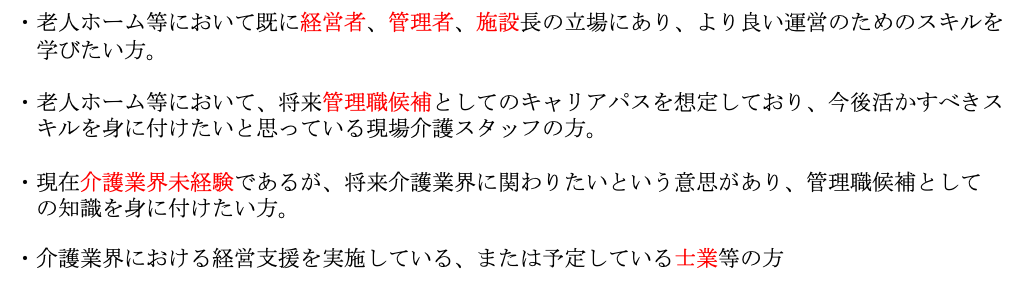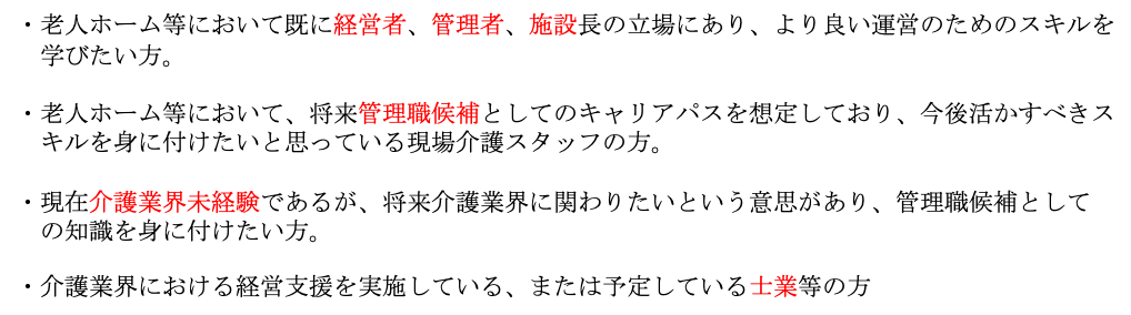 「介護経営管理士」を受講する人材については、広報活動を実施し広く受講生を集めることを考えております。また、資格取得者のうち介護業界への就職を希望される方は、介護事業所に関する情報提供をさせていただきます。