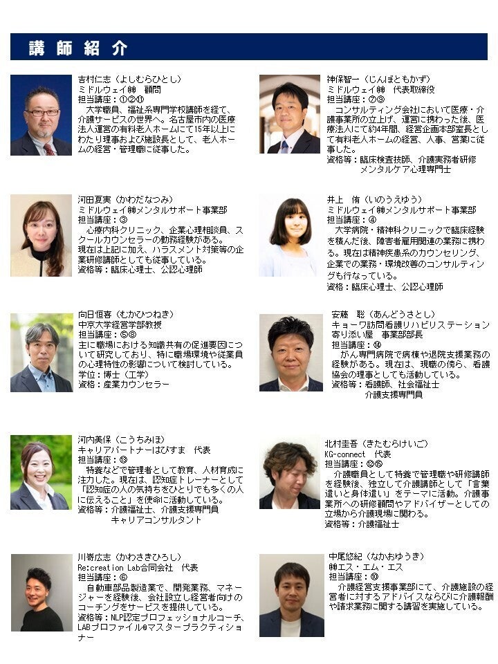 医療・介護福祉連携とチーム介護/介護福祉コミュニケーションおよび接遇/近年のハラスメント傾向と対策/メンタルヘルスと従業員支援プログラム/人材マネジメントとエンゲージメント/人材育成とコーチング