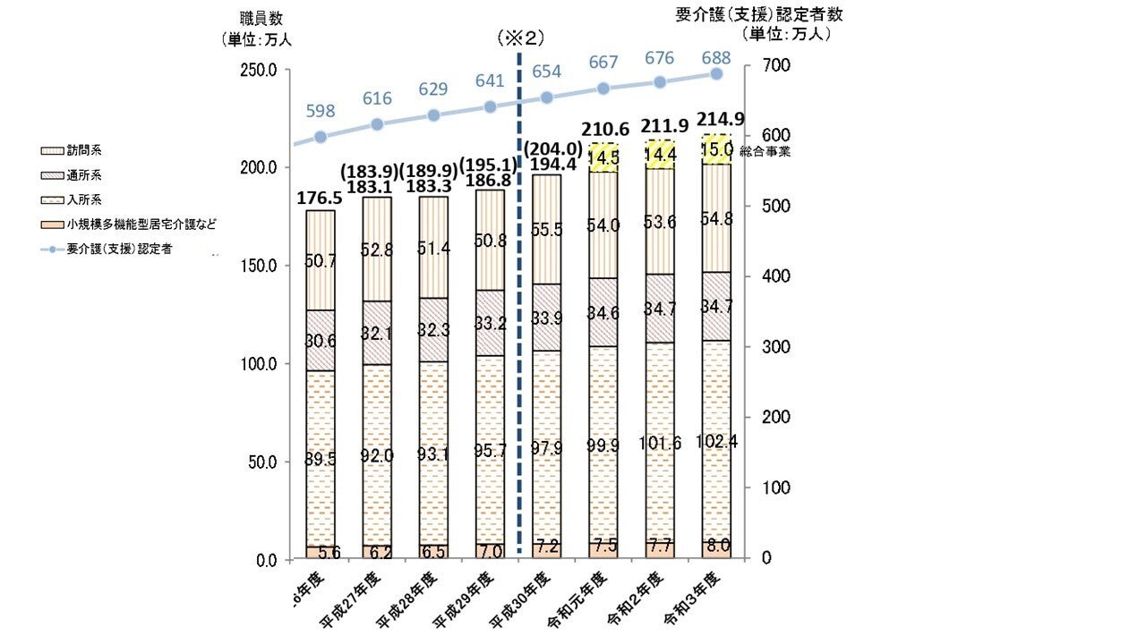 出典:厚生労働省 「介護サービス施設・事業所調査」(介護職員数)、「介護保険事業状況報告」{要介護(要支援)認定者数}