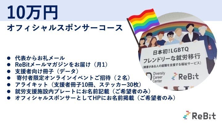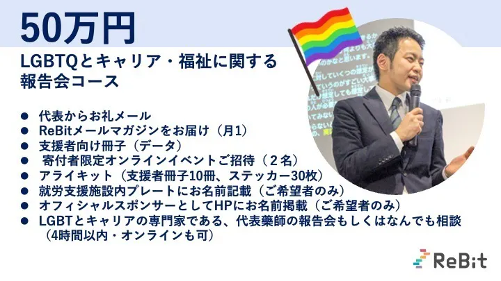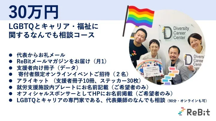 昨年はReBitをご支援いただき、誠にありがとうございました。皆さまからのあたたかい応援のおかげで、「ダイバーシティキャリア大阪」を設立し、運営することができています。今年2024年のReBitは、「全国300校でLGBTQの子どもたちも安心安全な学校環境を先生と一緒につくりたい」というプロジェクトを立ち上げ、6/18~7/31までクラウドファンディングを実施しています!https://camp-fire.jp/projects/768171念願叶い、教科書にLGBTQが掲載。「授業」だけでなく「学校生活」を変える、次の挑戦へ。団体設立時からの夢であった「すべての教科書に、LGBTQを」が叶い、2024年度から全小学校教科書に多様な性について記載されました。義務教育のなかで「1コマの授業」が叶った今、次の挑戦は「学校での日常を、365日変える」こと。LGBTQだからと、いじめられないこと。学びの機会を奪われないこと。「男なんだから」「女らしくしなさい」と、自分らしさを奪われないこと。先生にも、セクシュアリティについて安心して相談できること。相談せずとも困らずに、毎日の学校生活をただただ楽しめること。そんな、LGBTQもありのままで過ごせる学校を、今こそ全国に広げたいと願っています。そこで、先生200名の声を元に作成した、学校環境づくりの実践事例や相談対応をまとめた「学校できることキット」を開発。教員育成を通じ、LGBTQも安心安全な学校を全国に広げることを目標に、クラウドファンディングを行っています。詳細はこちらから→https://camp-fire.jp/projects/768171LGBTQを含めた全ての人たちが自分らしく暮らせる、そんな社会を一緒に広げていただけましたら幸いです。ぜひ、応援・お力添えをお願いいたします。 もっと見る
