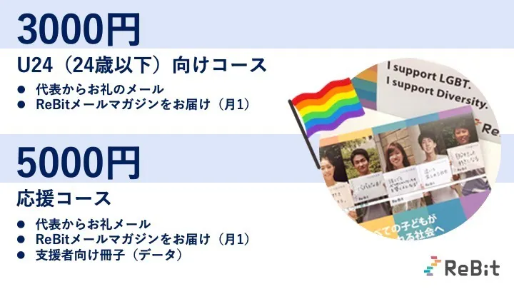 ※「本プロジェクトへのご寄付は特定非営利活動法人ReBitへの寄付となり、弊団体が寄付金の受付及び領収証発行を行います。このプロジェクトの寄付は寄付金控除の対象になります。「寄附金控除」をお受けいただくためには、確定申告の際に、特定非営利活動法人ReBitが発行した領収証をもって確定申告をしていただく必要がございます。領収書は年末に発送します。(領収証はCAMPFIREではなく当団体が発行・郵送いたします。)