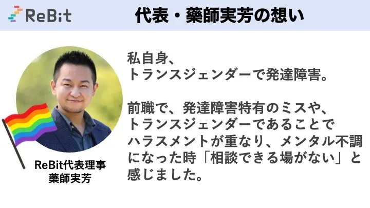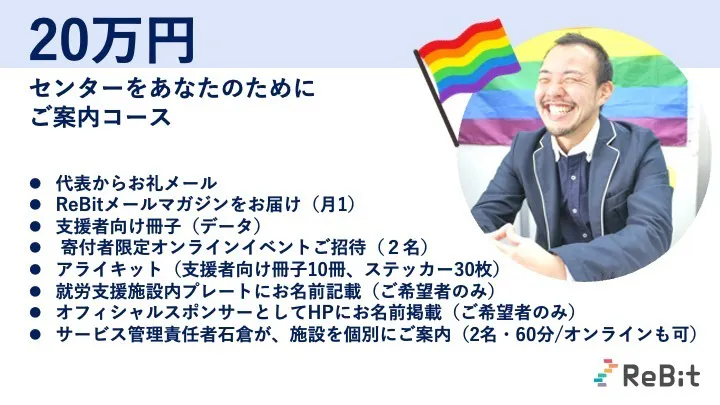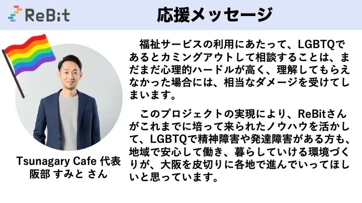 2023/06/30 12:00間々田 久渚さん(一般社団法人ハレルワ 代表理事)からクラウドファンディングへの応援メッセージをいただきました。ありがとうございます!ーーーーーLGBTQの理解がない福祉サービスの場では、自己開示ができなかったり、カミングアウトが受け入れられず、メンタルヘルスが悪化するなど適切な支援を受けることが難しい場合があります。安心して働ける環境を提供し個々の能力を最大限に活かすための支援や相談が受けられる場所が必要です。すべての人が自己を受け入れ、尊重されながらキャリアを築ける社会が広がることを願って、ReBitの活動を応援しています!ーーーーー【LGBTQと福祉 の架け橋となるセンターを大阪に】自治体や障害福祉事業者等の社会資源がLGBTQへの理解を促進し安全に利用できる環境創りが必要です。その挑戦の第一歩として、大阪市天満橋に「ダイバーシティキャリア大阪」を設立し、大阪府からの応援の元、地域福祉資源の啓発連携と、地域全体でのLGBTQへの安全網づくりに寄与したいと願います。本プロジェクトは大阪府・村上財団にご支援を頂きマッチング寄付としてあなたのご寄付が2倍になります!ぜひ、参加・応援をお願いします。あなたの力が必要です。 もっと見る