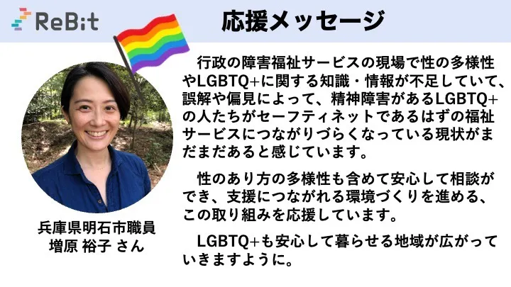 福祉は生きるなかで何度も活用しうるセーフティーネットだからこそ、LGBTQも安心して福祉や支援を受けられる地域は、LGBTQも安心して生きられる地域です。LGBTQを含めた全ての人たちが自分らしく暮らせる、そんな社会を一緒に広げていただけましたら幸いです。ぜひ、応援・お力添えをお願いいたします。