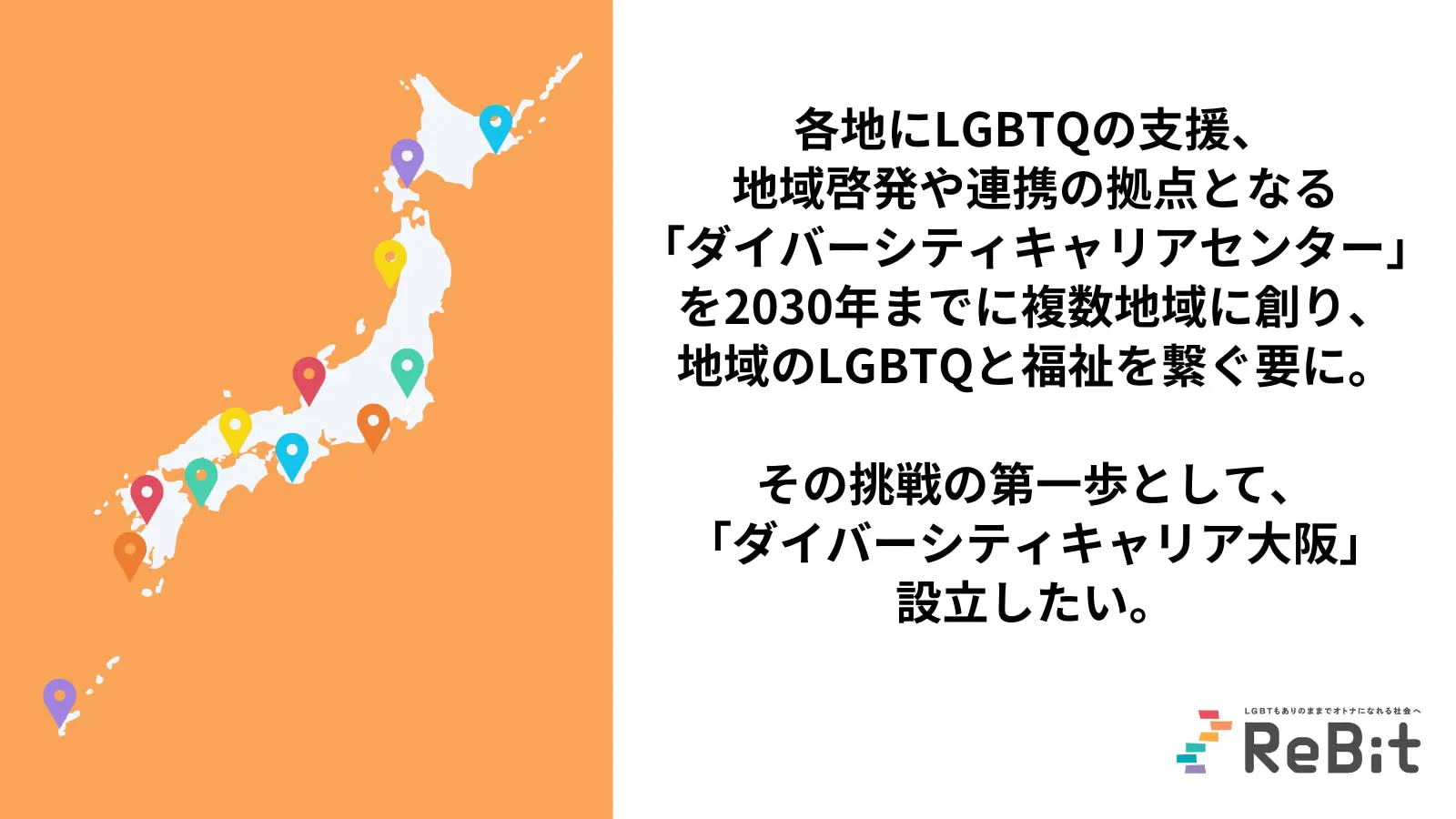 喫緊な状況に応え、支援の輪を広げるために、各地にLGBTQの支援・地域啓発や連携の拠点となれる就労移行支援事業所「ダイバーシティキャリアセンター」を2030年までに複数地域に創り、地域のLGBTQと福祉を繋ぐ要になりたい。
