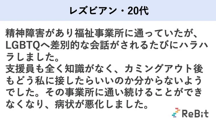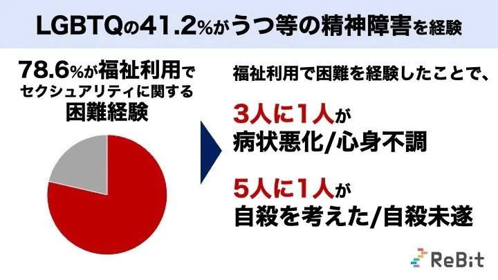 LGBTQはうつ等の精神障害におけるハイリスク層。しかし、「福祉サービスの利用を申し込んだから、他の人の迷惑になると断られた」等、安全に福祉サービスを利用できていません。