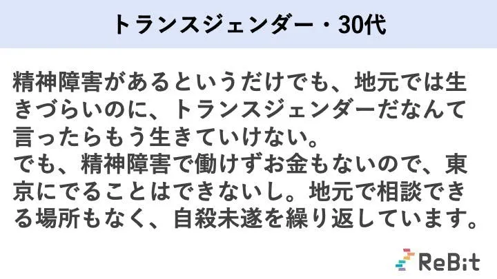 ■LGBTQの4割がうつ等の精神障害を経験。福祉を安全に利用できず、5人に1人が自殺を考えた。
