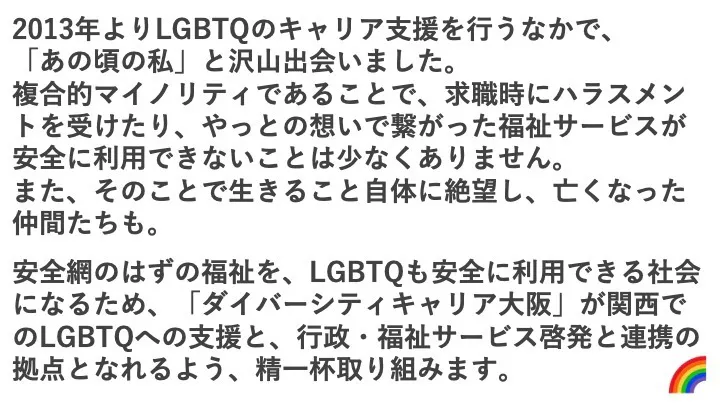 その挑戦の第一歩として、大阪市天満橋に「ダイバーシティキャリア大阪」を設立し、大阪府からの応援の元、地域福祉資源の啓発連携と、地域全体でのLGBTQへの安全網づくりに寄与したいと願います。