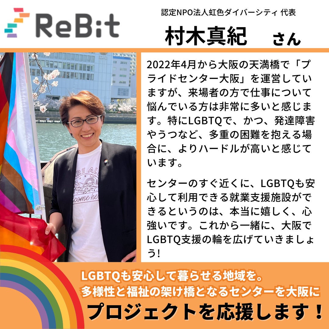 間々田 久渚さん(一般社団法人ハレルワ 代表理事)からクラウドファンディングへの応援メッセージをいただきました。ありがとうございます!ーーーーーLGBTQの理解がない福祉サービスの場では、自己開示ができなかったり、カミングアウトが受け入れられず、メンタルヘルスが悪化するなど適切な支援を受けることが難しい場合があります。安心して働ける環境を提供し個々の能力を最大限に活かすための支援や相談が受けられる場所が必要です。すべての人が自己を受け入れ、尊重されながらキャリアを築ける社会が広がることを願って、ReBitの活動を応援しています!ーーーーー【LGBTQと福祉 の架け橋となるセンターを大阪に】自治体や障害福祉事業者等の社会資源がLGBTQへの理解を促進し安全に利用できる環境創りが必要です。その挑戦の第一歩として、大阪市天満橋に「ダイバーシティキャリア大阪」を設立し、大阪府からの応援の元、地域福祉資源の啓発連携と、地域全体でのLGBTQへの安全網づくりに寄与したいと願います。本プロジェクトは大阪府・村上財団にご支援を頂きマッチング寄付としてあなたのご寄付が2倍になります!ぜひ、参加・応援をお願いします。あなたの力が必要です。