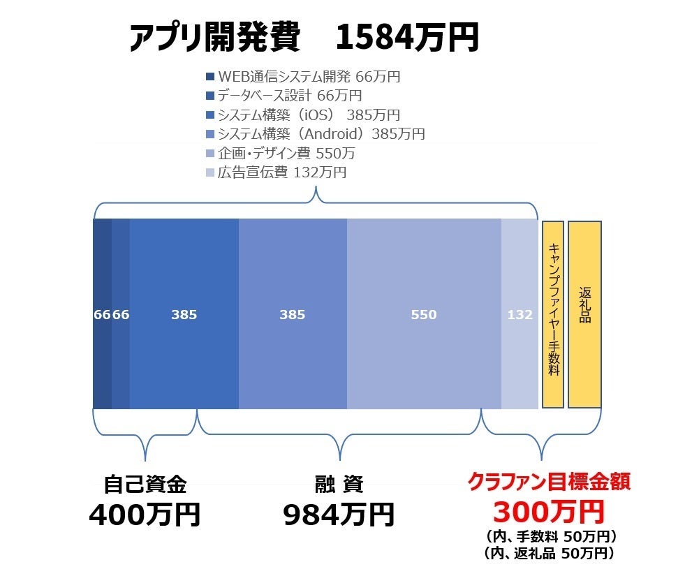 アプリ開発費+キャンプファイヤーシステム利用料17%+返礼品で、総額1千5百万円を超えるプロジェクトとなります。これまで400万円以上の自己資金を投じ、完成まであと一歩というところまできました。ただ、ゲーム的要素を搭載するには、追加の開発資金が必要です。本プロジェクトを通じて、日常的に楽しめるゲームアプリを作る手助けをしていただけませんか?
