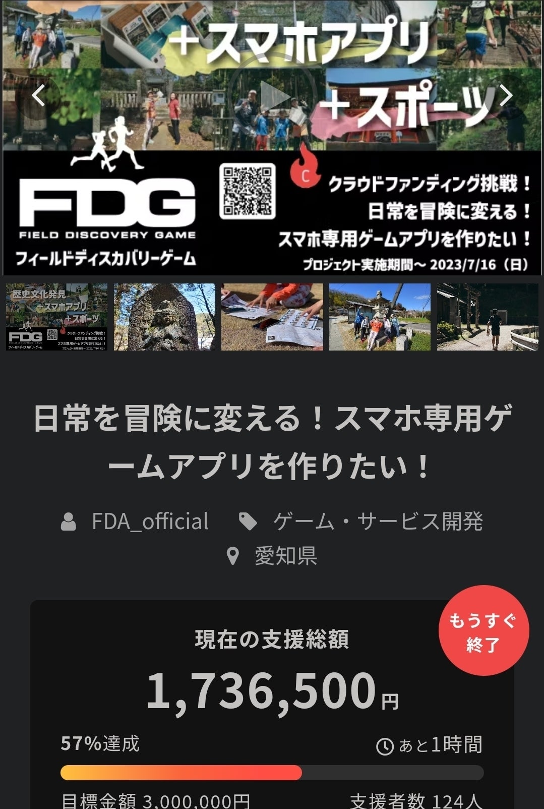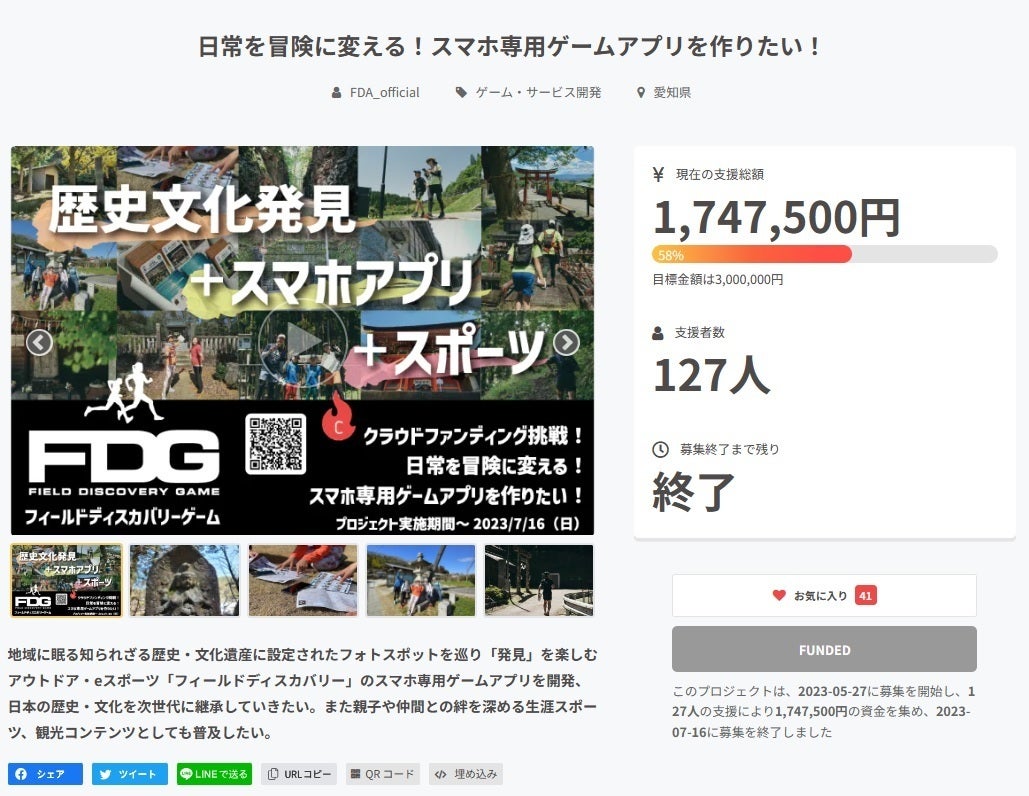2023/08/26 19:09フィールドディスカバリー協会の竹内鉄平です。クラファンにご支援・ご協力くださった皆様へご報告です。遂に...アプリが完成、本日(8/26)android版・iPhone版ともに正式リリースとなりました!以下のアプリ紹介サイトより、無料でダウンロード・インストールができます。日常を冒険に変える!リアルワールドRPG「FieldDiscoveryGame」https://fielddiscoverygame.com/※東海エリア中心に約2500スポットをアプリにデータ登録しています。今回のアプリ開発には企画段階から考えると3年…こんなアプリがあったら、世の中が大きく変わる!と信じてやってきましたが、ここまで時間とお金がかかるとは正直思っておらず、予想以上に大変な道のりでした。しかし、今回のクラファンで、皆様から背中を押され、一気に開発スピードが加速!この1ヵ月は寝る間も惜しんで、アプリ開発に全エネルギーを投入してきました。本当にできるのか?間に合うのか?不安になることもありましたが、本日リリースされたアプリを自分のスマホにインストールしてみて、ようやく世間に発表できるところまで来たんだと、非常に感慨深いものがありました。今までにない画期的なアプリができたと思っています。ぜひ一度触ってみてください。ただアプリの全機能はまだ完成しておりません。不具合も見つかっています。まだまだここからが本当のスタートとなります。まずは多くの皆さんにアプリを使って頂き、ご感想を頂ければと思っています。もう一度、日本を世界に誇れる国にするため!日本の素晴らしい歴史と文化を次世代に継承するため!スポーツとアカデミックをゲームで融合したコンテンツを発信、世の中を変えていく!引き続き応援のほど、よろしくお願いします!尚、クラファンのリターンについては、来週以降に皆さまのお手元に届くよう、発送準備を進めております。今しばらくお待ちください。9/3(日)愛知県みよし市にて、新アプリを使ったリリース記念イベントを開催します!アプリの遊び方の説明も行います。お近くの方はぜひご参加ください。アプリリリース記念テストイベント「FDG in みよし」(3時間)https://www.facebook.com/events/651821960343437/2023FDG東海ステージ第2戦「FDG in 岡崎」エントリー募集中!一般社団法人フィールドディスカバリー協会 代表理事 竹内鉄平 もっと見る