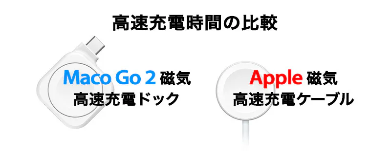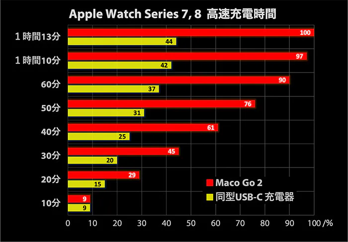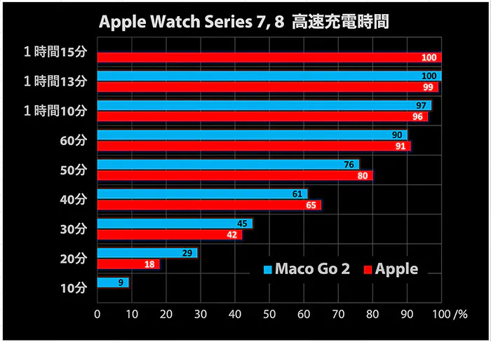 Apple Watch Series 7 (GPSモデル)の高速充電時間を10分間隔で計測しました。Maco Go 2とApple高速充電ケーブルの間で、経過時間毎の充電率に若干の差があります。最終的に100%フル充電までの時間差は2分です。