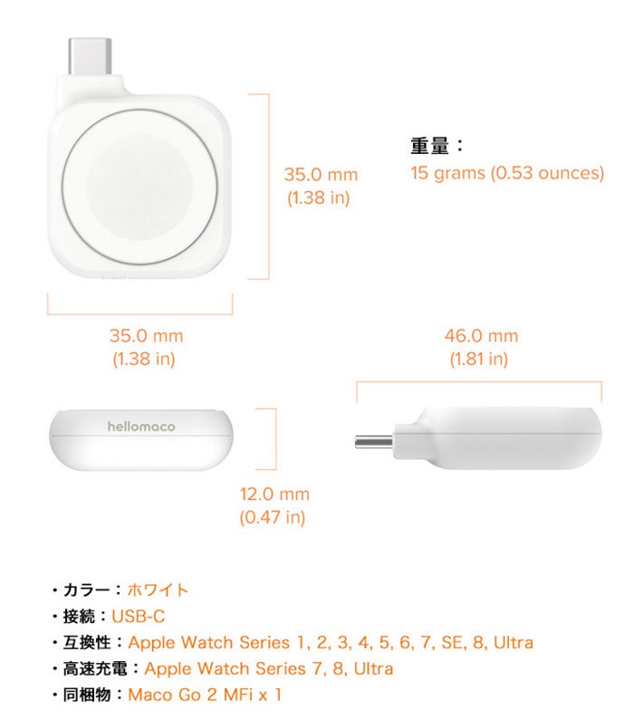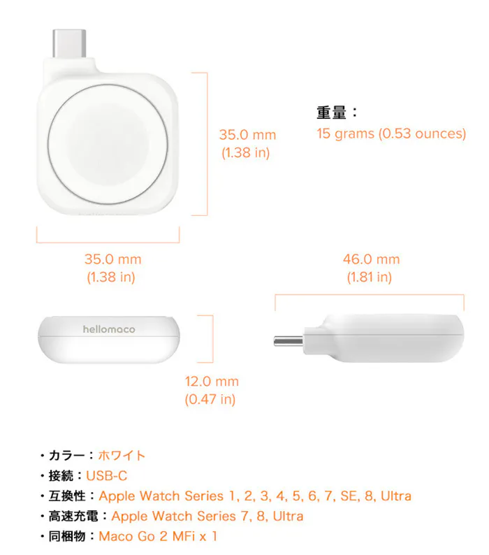 新開発のMaco Go 2は、Maco Goのデザインを踏襲し、Series 7以降の高速充電に対応、Apple MFi認証の信頼性とApple Watch充電速度として最も速い充電性能を備えた充電器です。超小型でポケットに忍ばせれば、抜群の携帯性で外出先でもどこでもストレスなく使える便利さです。