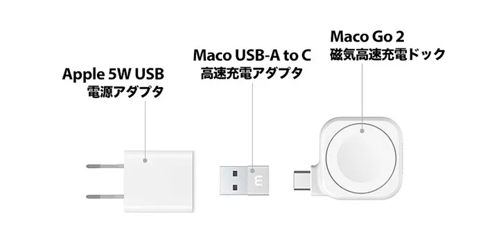 新開発のMaco USB-A to C 高速充電アダプタは、一般的なアダプタと異なります。Maco Go 2と同時開発、Apple WatchをUSB-Aポートから高速で充電します。充電時間は、USB-Cポートの高速充電時間と遜色ない高速充電が体験できます。Maco Go 2とMaco USB-A to C 高速充電アダプタがあれば、まさに鬼に金棒です。なお市販の変換アダプタは、高速充電に対応していないだけでなく、Maco Go 2で動作しませんのでご注意ください。