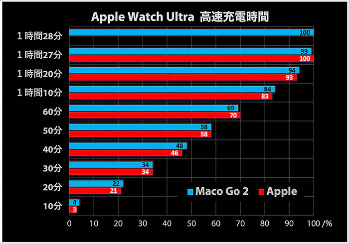 Apple Watch Ultra (GPS + Cellularモデル)の高速充電時間を10分間隔で計測しました。Maco Go 2とApple高速充電ケーブルの間で、経過時間毎の充電率に若干の差があります。最終的に100%フル充電までの時間差は1分です。
