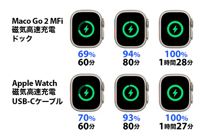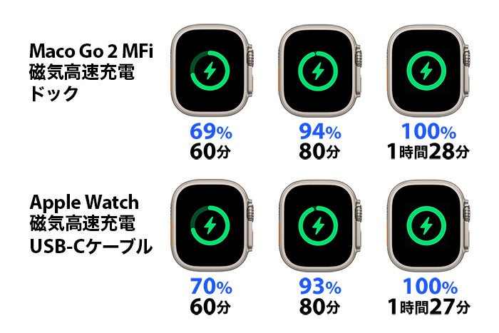 参考までに、Maco Go 2 と Apple高速充電ケーブルを使い、Apple Watch Ultra (GPS + Cellularモデル)の充電時間を比較しました。計測の結果、速さはほとんど同じです。搭載されている高速充電モジュールが同じなので当然の結果です。1時間で約70%、100%充電するまでわずか約1時間30分です。