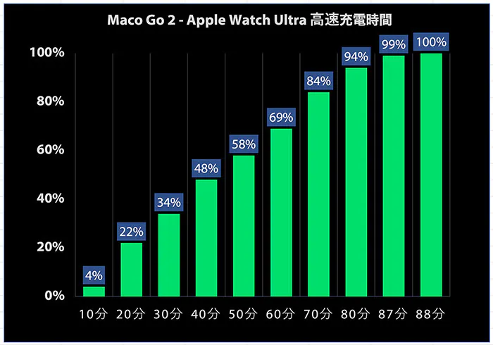 Maco Go 2をUSB-C電源アダプタへ接続し、Apple Watch Ultra (GPS + Cellularモデル)の充電時間を計測しました。100%充電完了まで1時間28分(88分)かかりました。・テスト環境:Anker PowerPort III Nano 20W 充電器(USB-C)へMaco Go 2 を接続。10分間隔で計測。