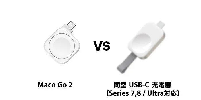 Maco Go 2(試作機)と類似の充電器を同じ環境下で充電速度の違いを計測しました。比較対象の充電器はオンラインモールで売上上位、性能は標準速度、USB-Cから直接充電、Series 7/8, Ultra対応機種です。Apple Watch Series 7(GPSモデル)と電源アダプタはAnker PowerPort III Nano 20Wを使い行いました。
