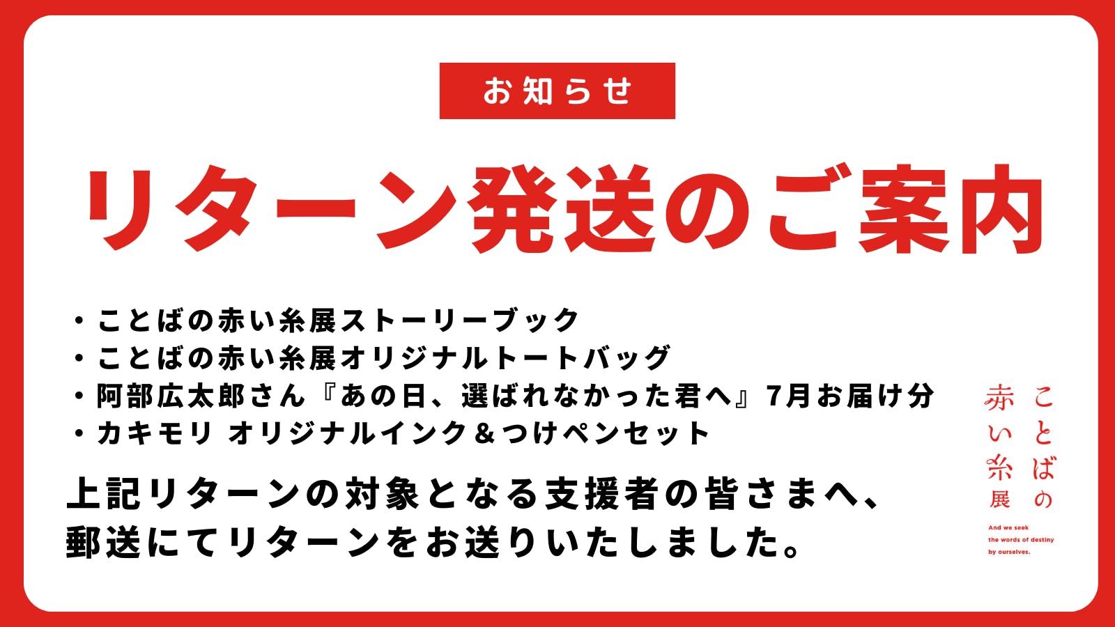 ※上記がリターン内容に含まれる「ことばの赤い糸展フルセット」の方も対象となります。