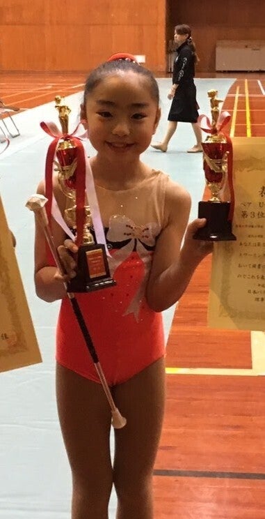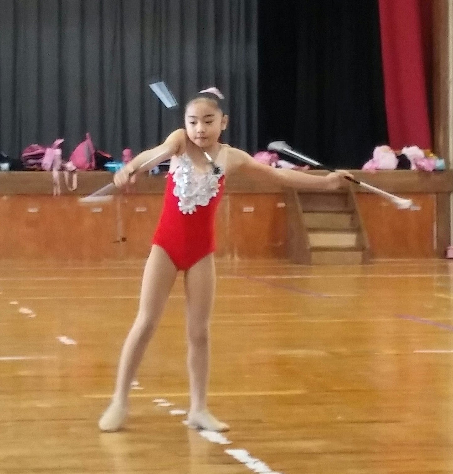 小学校2年生(バトンコンテストで全国共通規定演技で初級ソロトワールで金賞をいただき、上機嫌)