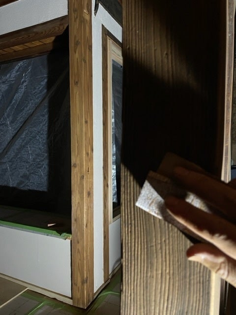 雨の日は畑作業もお休みなので、柱の木目をより良くみえるように、柱をひたすらヤスリがけです。やり方を工務店ののりさんに教えていただき、微力ながら夜な夜なスリスリとヤスリがけ。