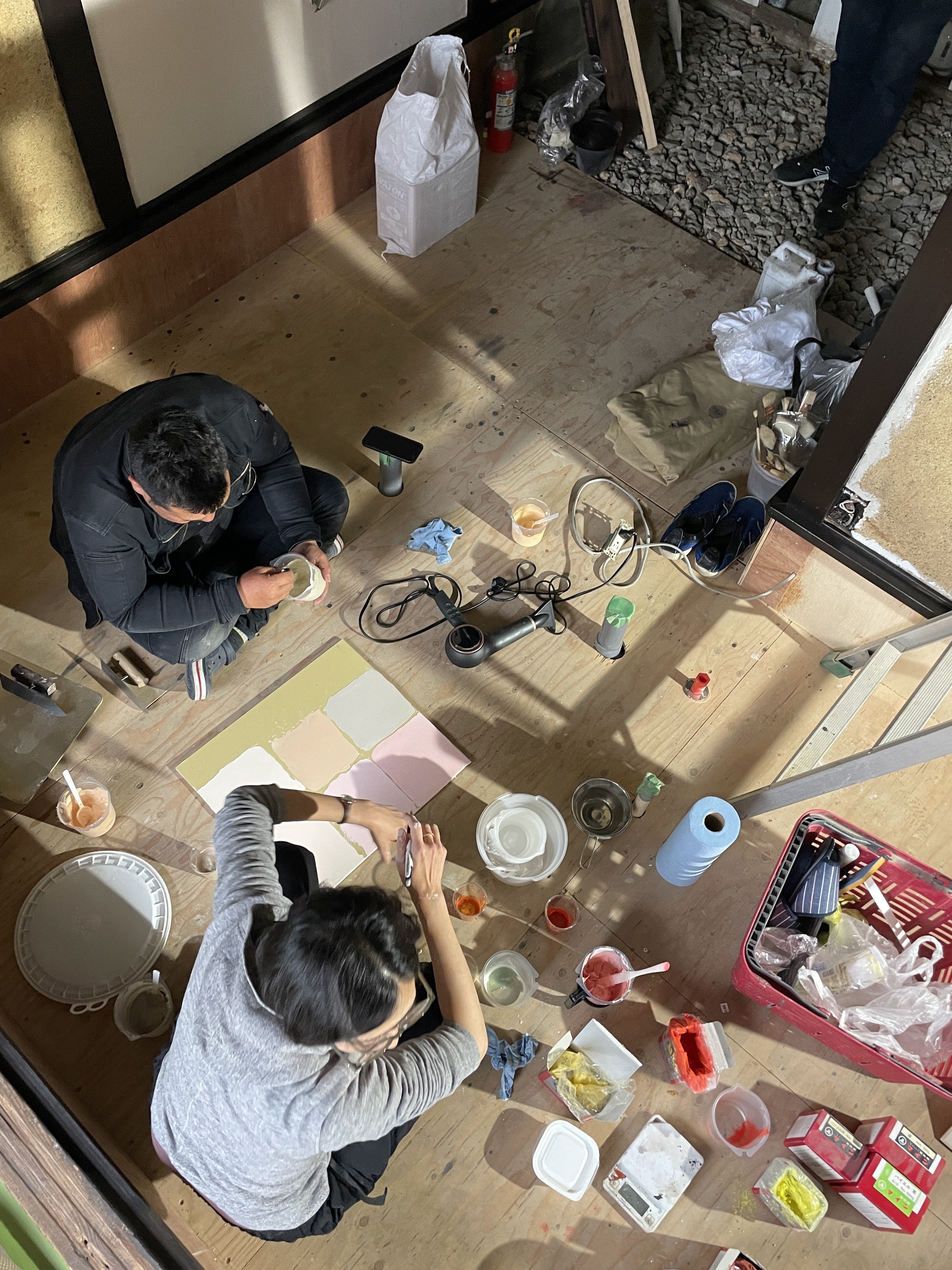 ※写真はプフ設計の石原さんと宮の工房の宮野さんがカウンターに塗る色をたくさんのサンプルを作っているところです。膨大な数のサンプルから一つベストを選びます、是非お楽しみにしておいてくださいませ。