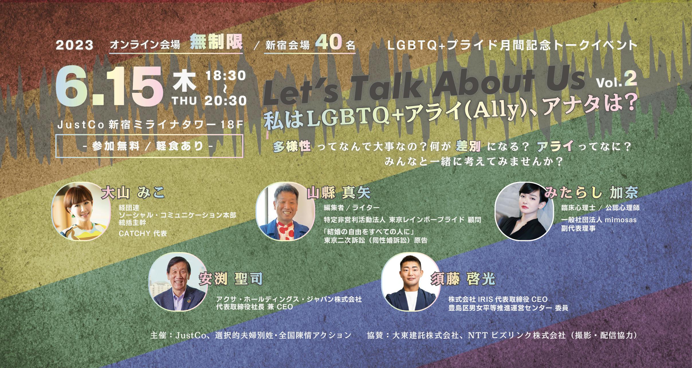 本イベントは、シンガポール発、プレミアムコワーキングスペース& シェアオフィスを展開するJustCoと、選択的夫婦別姓の法制化を中心にジェンダー平等を推進する活動を展開している選択的夫婦別姓・全国陳情アクションが、LGBTQ+の権利を啓発する活動月間「Pride Month(プライド月間)」を記念して共同開催するものです。