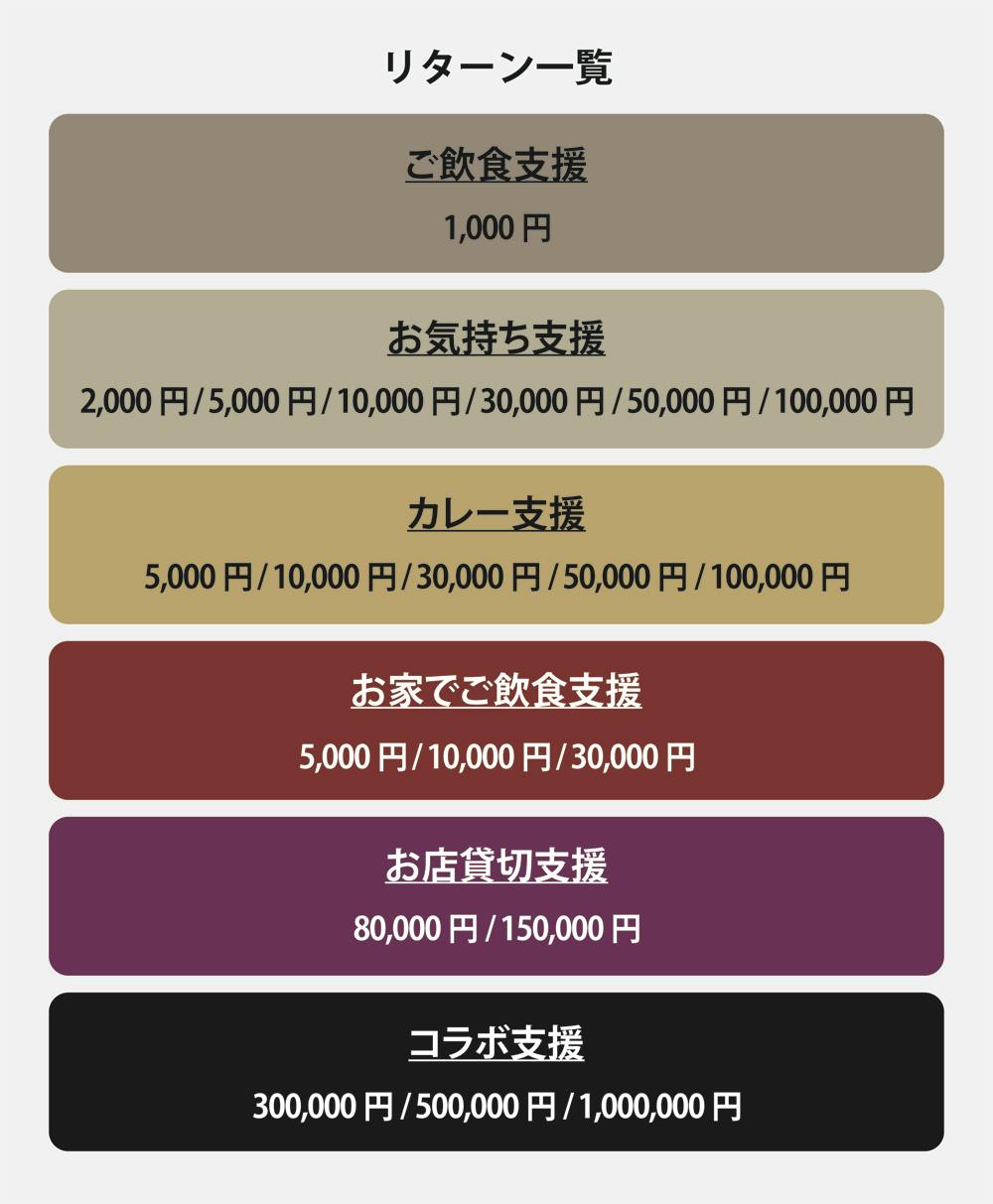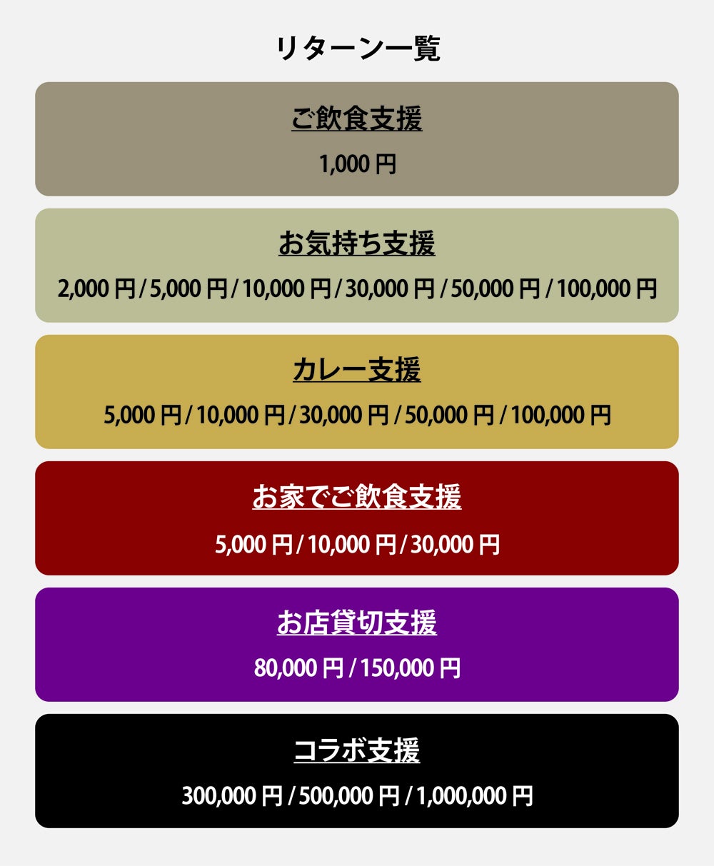 ・1,000,000円:一緒にオリジナルカレーを開発、お店で2ヶ月販売+オリジナルカレー券100枚+オリジナルレトルトカレー100食分