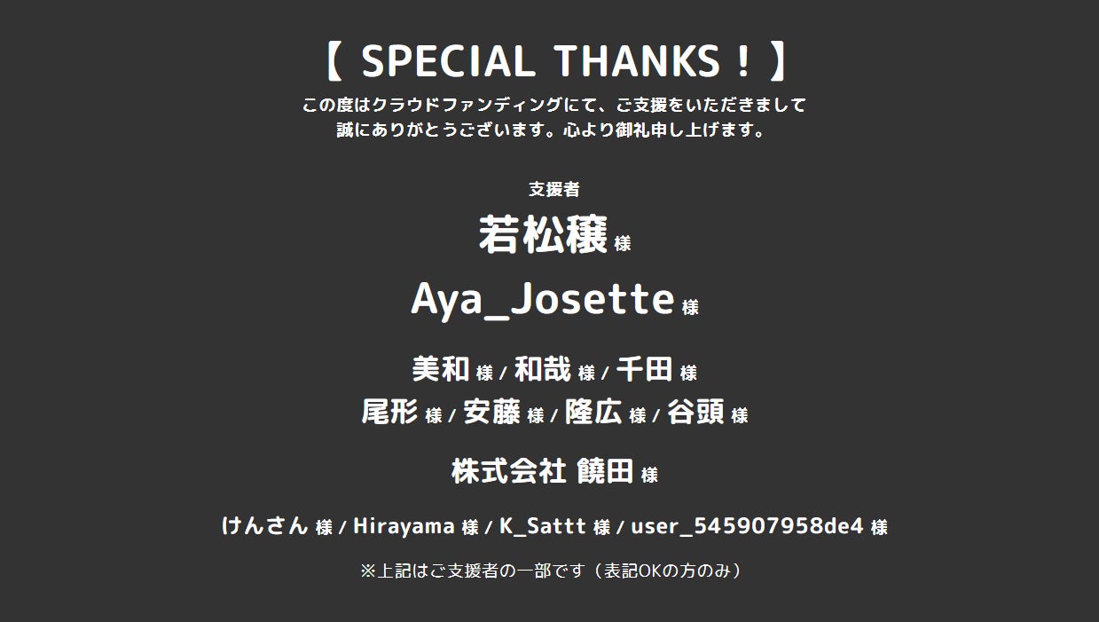 ※プロジェクト達成時にはCAMPFIREの手数料として総支援額の17%(弊社掲載手数料12%、決済手数料5%)+税が使用されます。