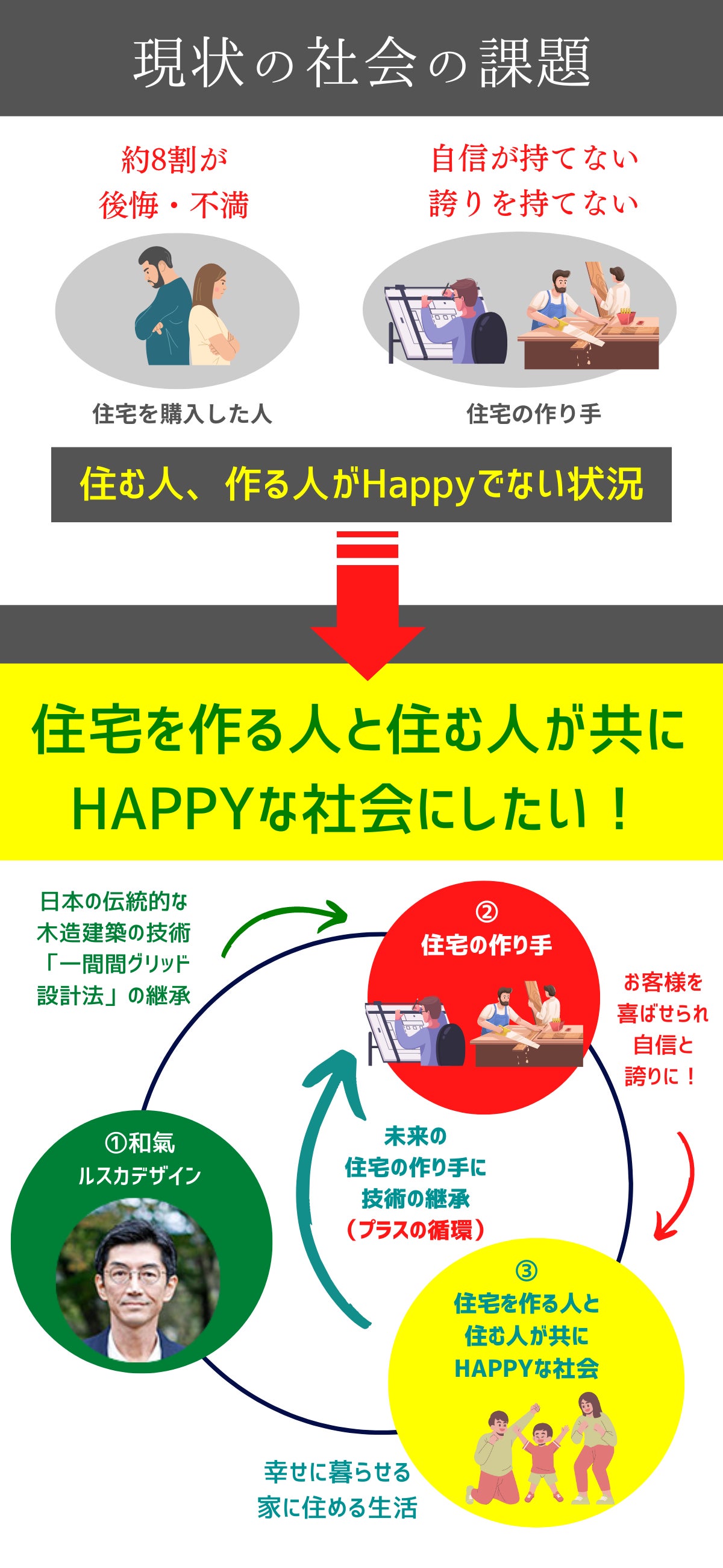 この課題を解消し、「住宅をつくる人と住む人が共にHAPPYな社会」を実現していきたいと思い、プロジェクトを立ち上げました!