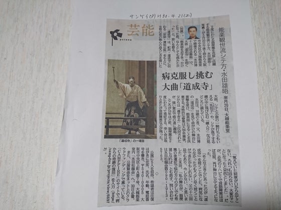 先程の活動報告の投稿で、達成率181%を「191%」と打ち間違えました、ごめんなさいm(__)m あと、昨夜コンビニに寄り購入し帰宅するつもりでしたが全く忘れておりました(。>д<) 昨日の毎日新聞夕刊で5/20の道成寺公演とcampfireさんのご協力を頂きクラウドファンディングチャレンジしている事を紹介して頂いております! 毎日新聞ご購読の方、ご覧頂ければ幸いですm(__)m アップしたのは産経新聞の記事です。読みにくいかと思いますがご容赦下さいませ(^^;