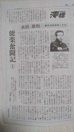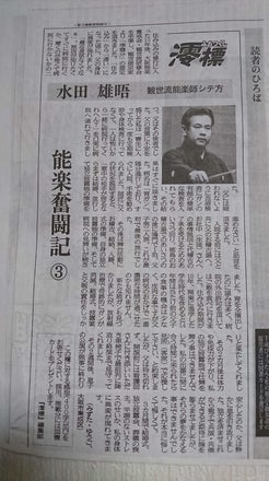 昨年大阪日日新聞さんの『澪標-みおつくし』のコラムで『能楽奮闘記』と冠して5回の連載をさせて頂きました。①~⑤の記事を順次載せて参りますがいかんせん『アナログ』な私。記事をアップしましたがズームして読めない方もいらっしゃるかも知れません(泣)画面を写真保存してから別に開き、それをズームしたら読めるかも知れません(>_<)不便をお掛けしますがどうぞご容赦下さいねm(__)m