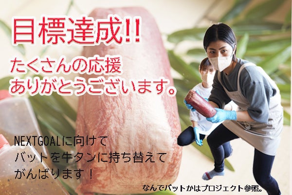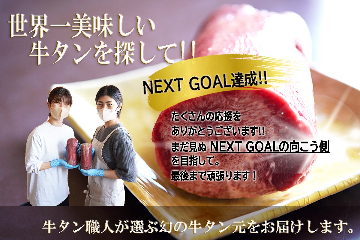 たくさんの方の応援のおかげで、NEXT GOALを達成することができました!!私たちの「本当に美味しい牛タンを食べて欲しい!」という、熱い想いがたくさんの方に届いているのだと思うと、感動で胸がいっぱいです!私たちの想いを受け取ってくださって、本当にありがとうございます!!まだまだプロジェクトの日数も残っておりますし、もっともっと多くの方に牛タン職人が選んだ幻の牛タンをお届けしたい!!まだ見ぬNEXT GOALの向こう側を目指して最後まで頑張りたいと思います。引き続き応援のほど、どうぞよろしくお願いいたします。