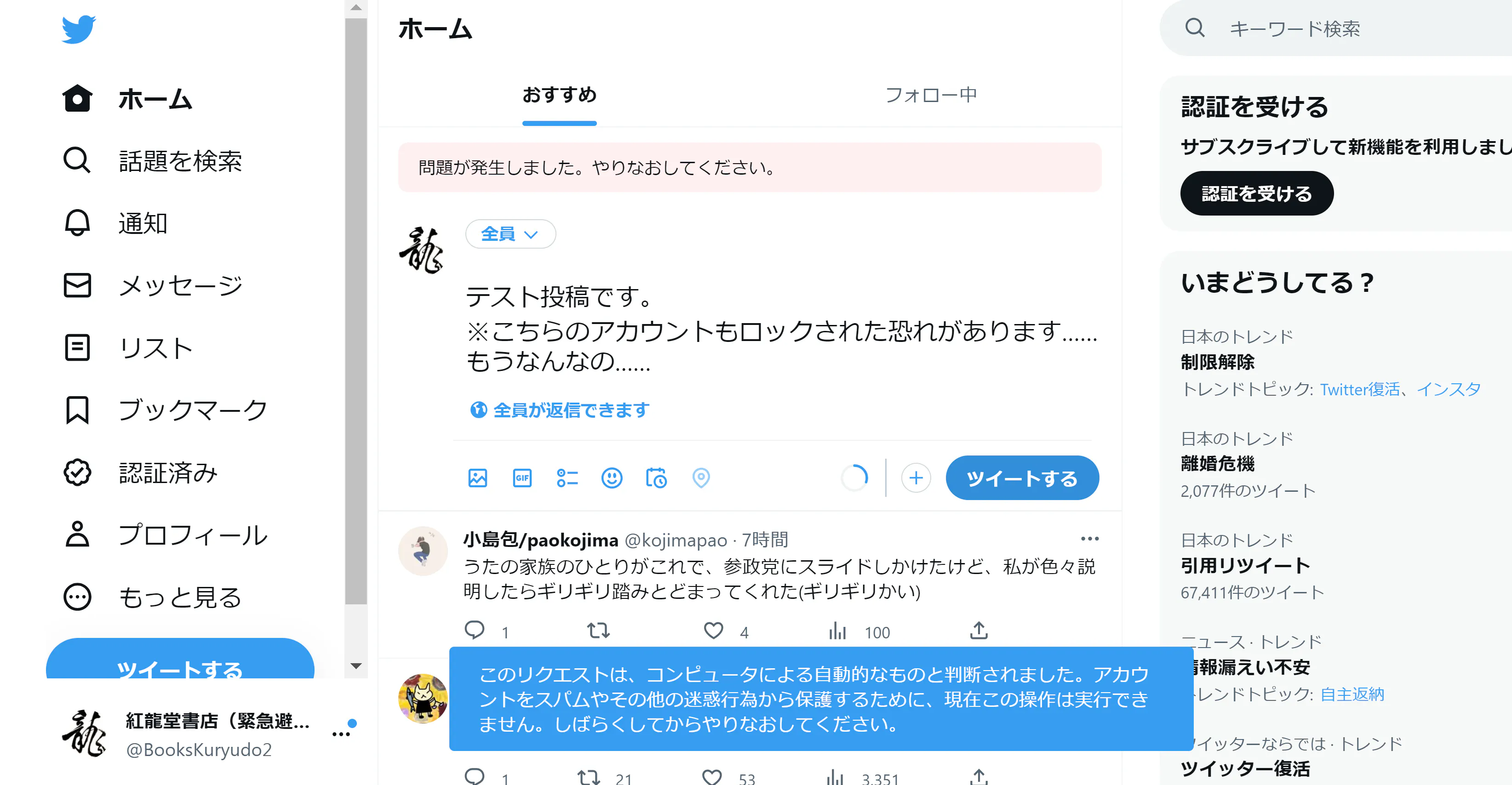 前回の活動報告をお送りしてからまだわずか数時間、Twitterの緊急避難アカウントも新設したばかりなのですが、数ツイートしただけでこちらの新設アカウントもロックされました。
