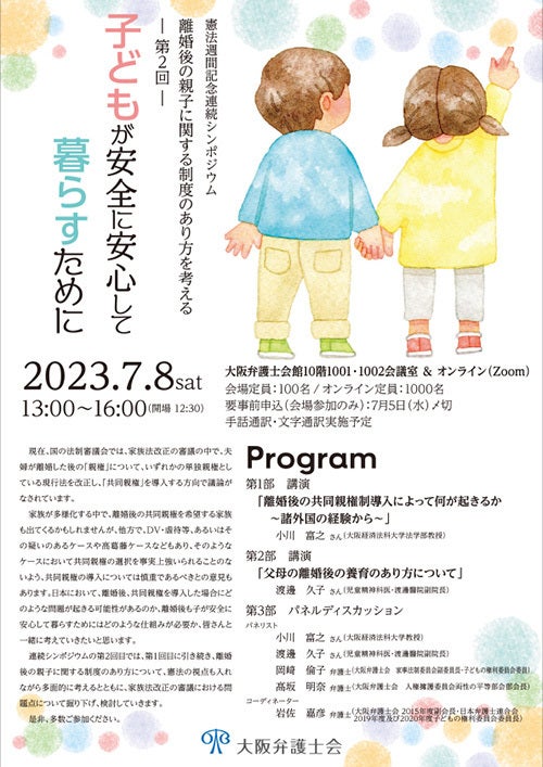 ■概要: 5月20日に開催いたしました第1回に引き続き、憲法週間記念シンポジウム「離婚後の親子に関する制度のあり方を考える(第2回) ~子どもが安全に安心して暮らすために~」を開催いたします。