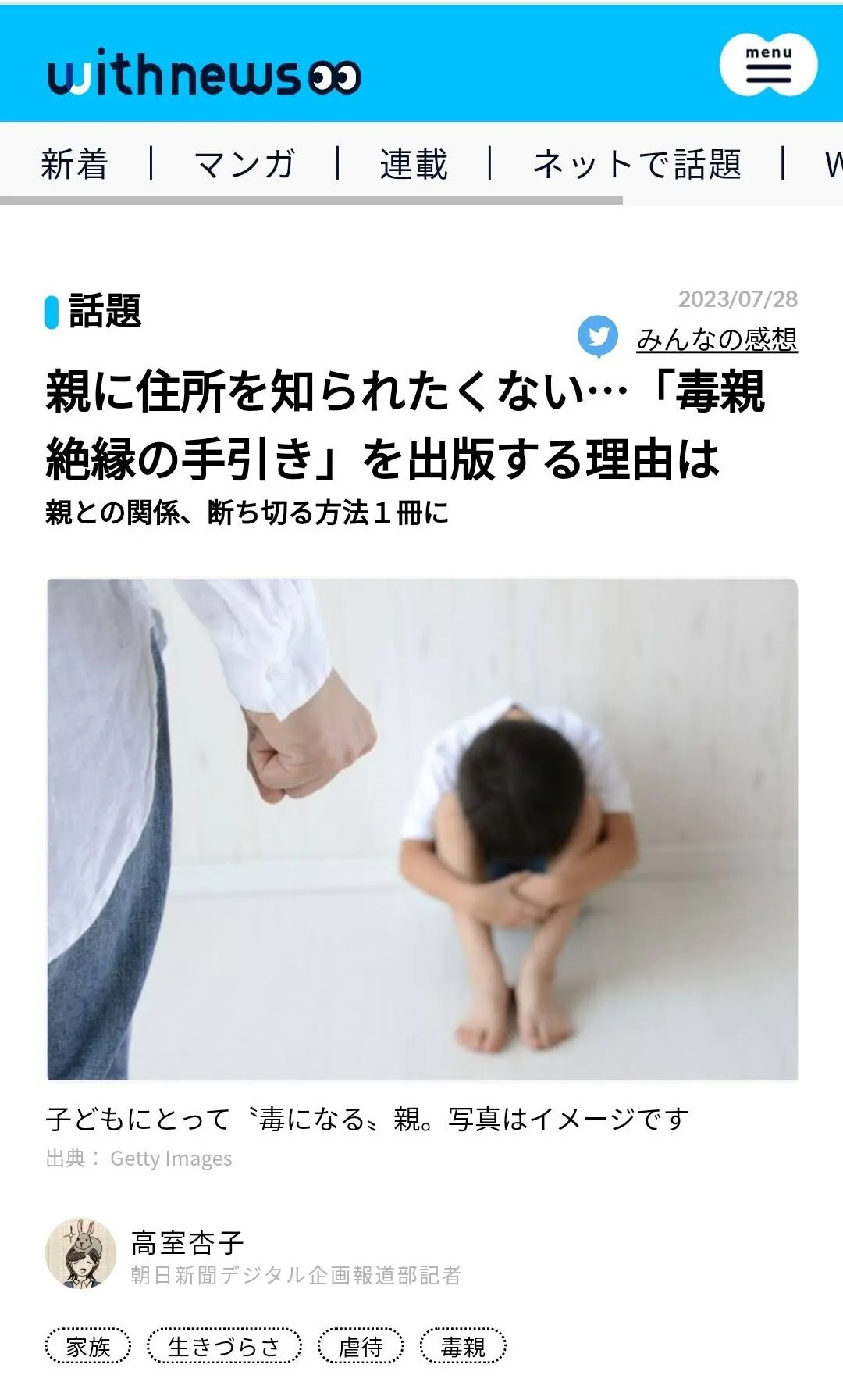 なんと、『毒親絶縁の手引き』が朝日新聞のwithnewsで取り上げられました!