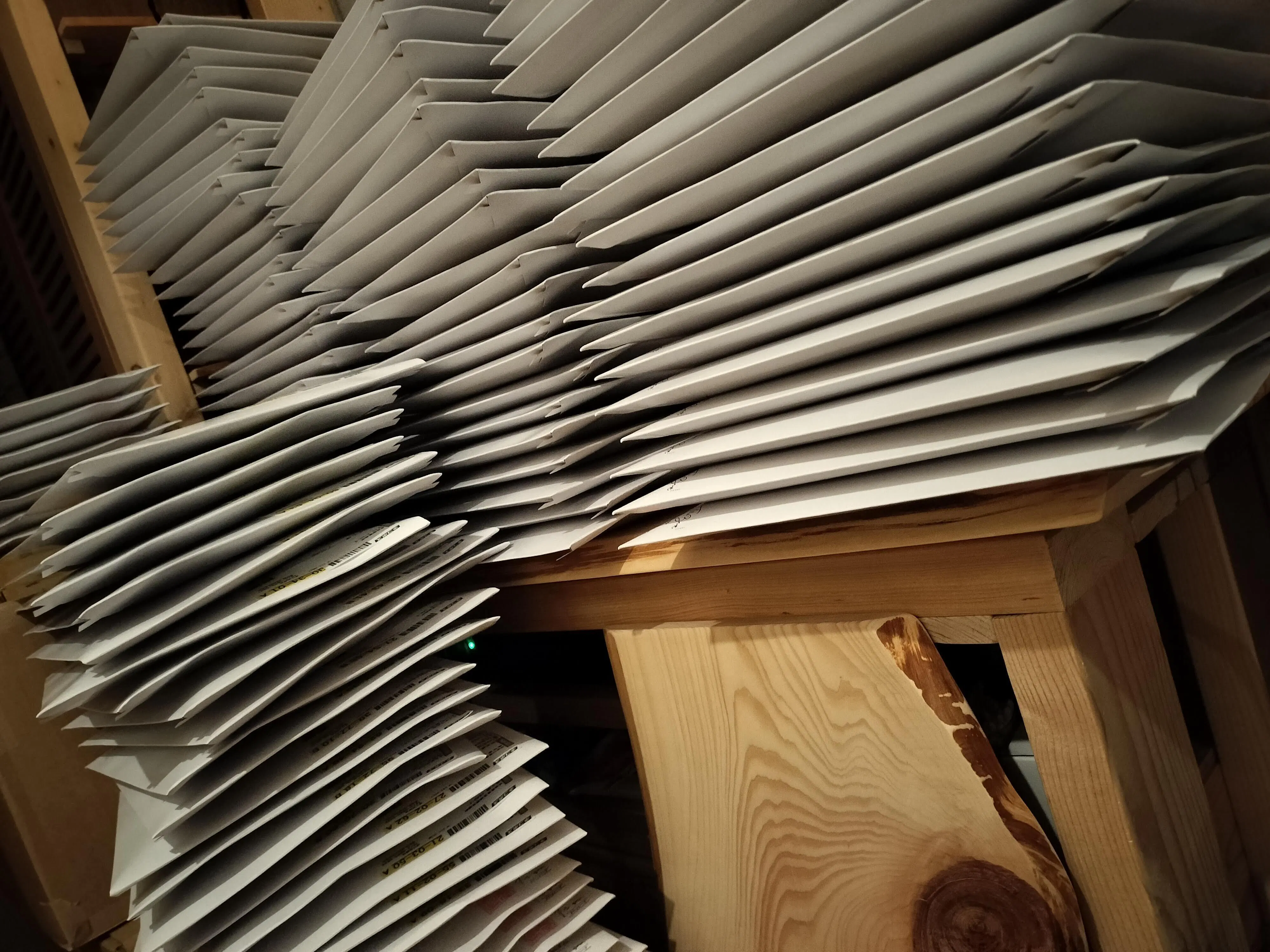 ただ①で記載しましたとおりいかんせん台風シーズンなので、対面受取でないお荷物・郵便受けから飛び出そうな箱などは、OPPテープやニスが塗布されているテープで3辺を留めるなどしております。
