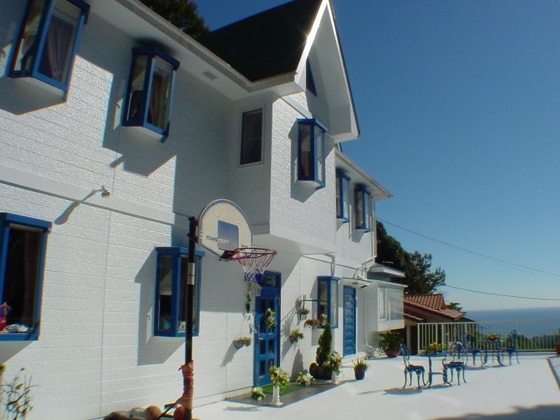 私たちはフレンドリーなホスピタリティ精神をモットーに、地元でとれた魚介類や野菜をハーブで調理した地中海料理を提供しています。また、湯量のたいへん豊富な熱川の温泉も宿の売りの一つです。ただ、こだわりということでは、なんと言ってもギリシャのエーゲ海を思わせる海が見える風景と白と青を基調にした宿の雰囲気です。