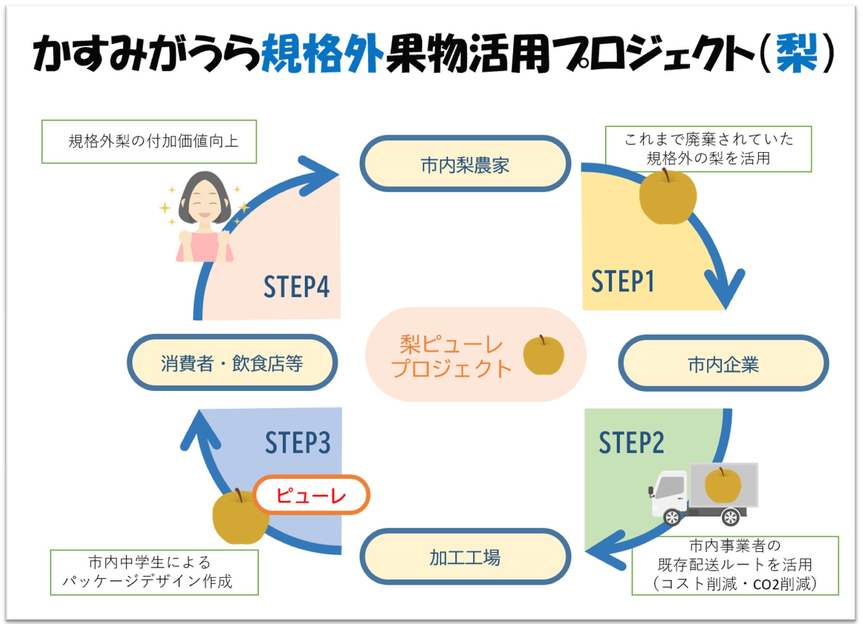 かすみがうら市産・規格外の新鮮な梨は、「かすみがうら市地域未来投資推進課」、梨を生産する「千代田果樹観光協会」と「市内の梨農家」、ピューレ製造を手掛ける「株式会社千代田組」、梨を加工工場まで運ぶ「かすみがうら市内企業」との連携によって「梨ピューレ」になります。今年は、市役所主導の元、かすみがうら市内の中学生が考えたデザインを元に商品パッケージが作られる予定です。