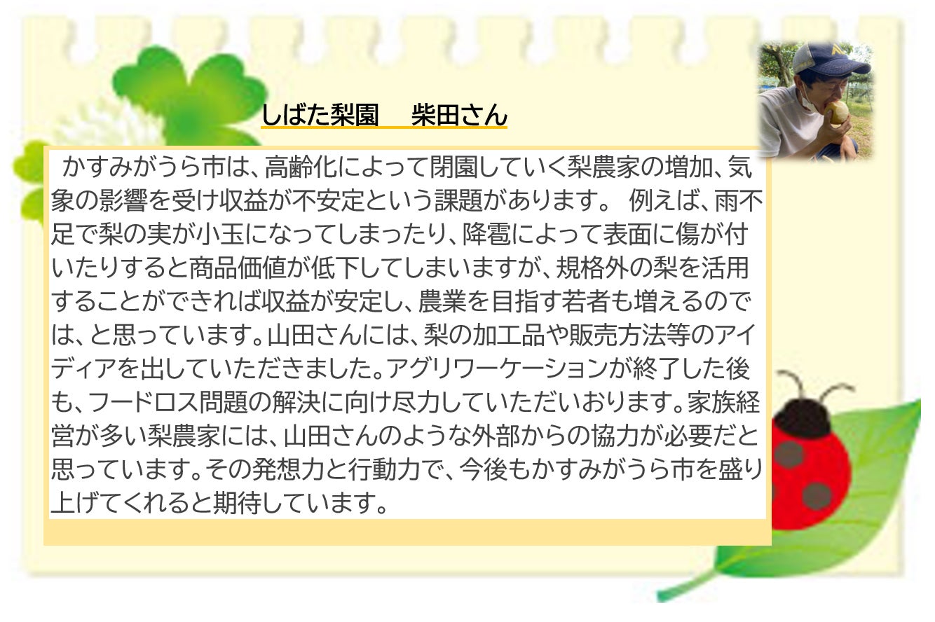 柴田さんは、古くから梨を作り続けている農家さんのもとで、かすみがうら市の果樹第三者継承者として、梨栽培を一から学び今に至っています。アグリワーケーションでは、実際に摘果や収穫を体験することで1年をかけて梨を作る苦労と喜びを学びました。
