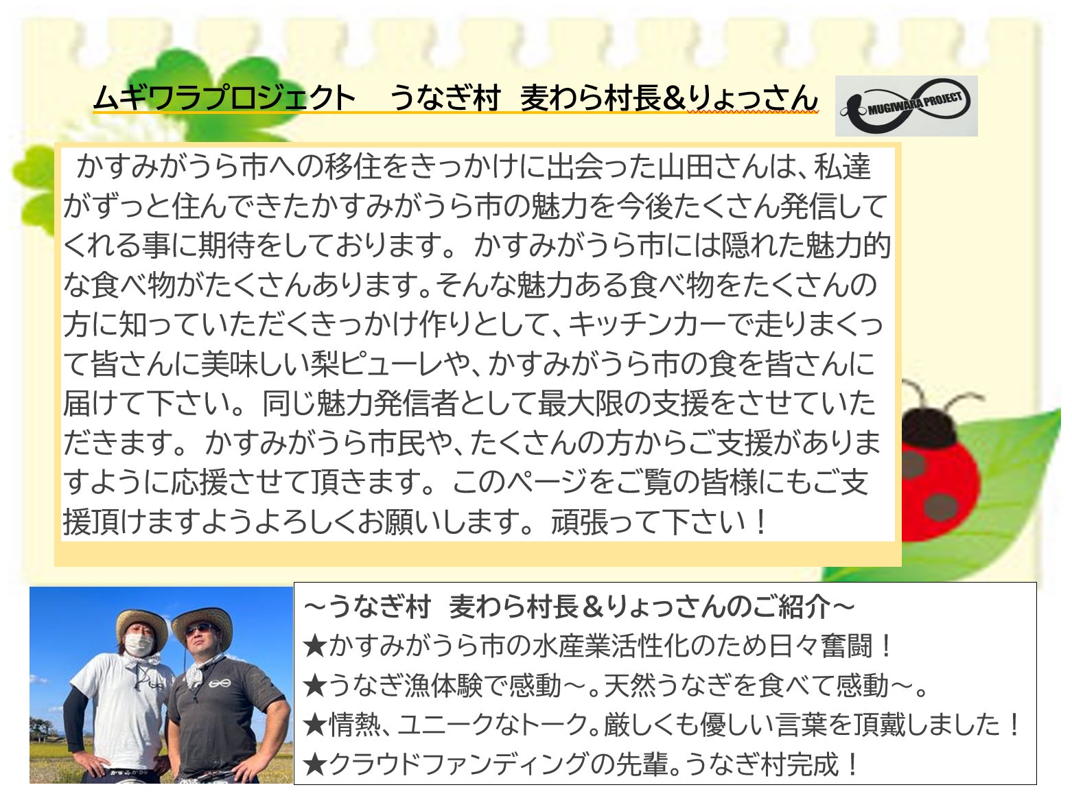 本プロジェクトの実施に当たり、かすみがうら市の多くの皆様からの支援や応援をいただいています。一部ですが、いただいた応援メッセージをご紹介します。