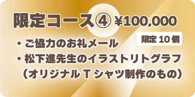 限定プラン⑤のリターン品は、『お礼のメール』に、ポストカード3種類全て。オリジナルTシャツ2枚(サイズ選択可能、色指定不可)、オリジナルグッズ(トートバック、マグカップ、ハンドタオルの3種類全て)、サイン色紙(ラッキー、ヴィッキー、松下先生の3枚全て)。